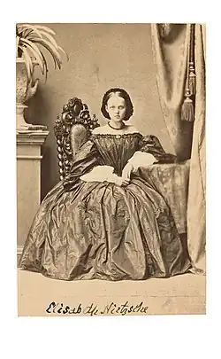 Elisabeth Nietzsche est le second enfant de Carl Ludwig Nietzsche (en) (1813-1849), un pasteur luthérien et de Franziska, née Oehler (1826-1897). Elle est baptisée « Therese Elisabeth Alexandra », du nom des trois princesses et filles de Joseph de Saxe-Altenbourg, dont son père avait été le précepteur[4]. Sœur cadette de deux ans de Friedrich Nietzsche, elle reçoit la même éducation luthérienne que son frère. Elle a aussi un petit frère, Karl Ludwig Joseph, né en 1848. Mais cette même année — elle n'a que trois ans — son père meurt, à 36 ans, et Karl Ludwig Joseph le suivra dans la tombe deux ans plus tard, en 1850. Franziska déménage alors à Naumburg avec ses deux enfants.