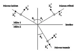 Pour deux milieux 1 et 2 homogènes et isotropes la loi de Descartes s'applique : avec l'angle d'incidence du faisceau dans l'air, et l'indice de réfraction complexe (convention , pour la convention ). La dépendance spatio-temporelle de l'amplitude des ondes, solutions des équations de Maxwell, est de la forme . Dans la direction de propagation , l'amplitude varie comme La partie réelle de l'indice complexe caractérise la longueur d'onde dans le matériau et la partie imaginaire, appelée coefficient d'extinction, caractérise la longueur d'atténuation de l'intensité .