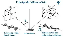 Considérons une surface et un faisceau incident de lumière polarisée. Une partie du faisceau est transmise ou absorbée à travers la surface, une autre est réfléchie. Dans les deux cas, l'état de polarisation du faisceau a changé. L'ellipsométrie est une technique qui mesure le changement de polarisation dû à la réflexion (ellipsométrie par réflexion) ou à la transmission (ellipsométrie par transmission). Cette modification de l'état de polarisation de la lumière incidente dépend de la surface étudiée.