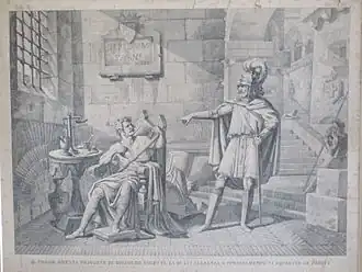 Gravure du XIXe siècle représentant Gautier III de Brienne qui arrache les bandages de ses blessures plutôt que d'accepter les propositions de Diépold d'Acerra.