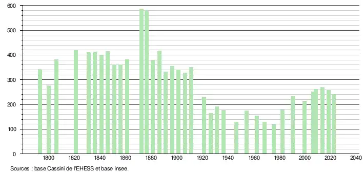 L'évolution du nombre d'habitants est connue à travers les recensements de la population effectués dans la commune depuis 1793. Pour les communes de moins de 10 000 habitants, une enquête de recensement portant sur toute la population est réalisée tous les cinq ans, les populations de référence des années intermédiaires étant quant à elles estimées par interpolation ou extrapolation[19]. Pour la commune, le premier recensement exhaustif entrant dans le cadre du nouveau dispositif a été réalisé en 2008[20].