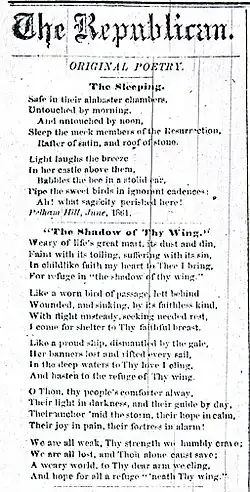 En 1864, plusieurs poèmes sont modifiés et publiés dans Drum Beat, afin de lever des fonds pour les soins médicaux des soldats de l’Union. Un autre poème parait en avril 1864 dans le Brooklyn Daily Union[114].