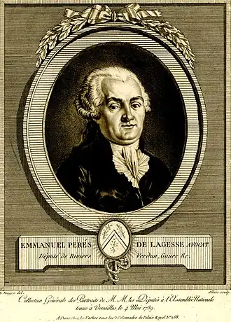 - ↑ Son acte de décès indique le nom de Pérès Emmanuel baron de la Gesse. Voir en ligne aux Archives départementales de la Haute-Garonne : http://archivesenligne.cg31.fr/FrmLotDocFrame.asp