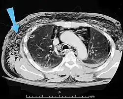 Scanner abdominal (rayons X) d'un patient présentant des emphysèmes sous-cutanés (fléchés). | |