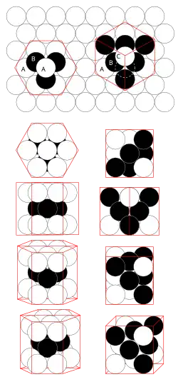 Par rapport à une couche d'empilement compact hexagonal plan choisie arbitrairement comme référence et notée A, il existe deux manières de placer le plan compact hexagonal au-dessus du premier : le positionnement B et le positionnement C :