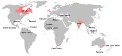 L'expression « Premier Empire britannique »[22] correspond à la période qui s'étend des premières implantations en Amérique sous le règne de Jacques Ier à la perte des Treize Colonies d'Amérique à la suite de la guerre d'indépendance des États-Unis (1776-1783).