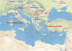 En 405, un groupe d'Ostrogoths, dirigé par Radagaise, issu de la confédération hunnique, envahit l'Italie, mais est vaincu par Stilicon à Florence.