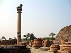 - ↑ Selon J. Irwin (notamment (en) « 'Aśokan' Pillars: A Re-Assessment of the Evidence », dans The Burlington Magazine, Vol. 115, No. 848, 1973, p. 706-720), la plupart de ces colonnes seraient antérieures à l'époque d'Ashoka, qui aurait simplement rajouté les inscriptions. Opinion peu suivie, cf. S. P. Gupta (trad. M. Pierre-Pilon), Les racines de l'art indien : Art et architecture de l'Inde maurya et post-maurya (IIIe et IIe siècles avant J.-C.), Paris, 1990, p. 36-45.