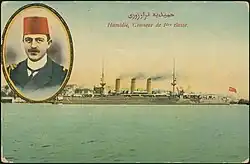 Parallèlement à ces contacts avec les Alliés, La poursuite des croiseurs Goeben et Breslau, en juillet-août 1914, contribue à faire basculer l'Empire ottoman dans le camp des puissances centrales. Le , les Britanniques, en violation des accords conclus, avaient saisi deux navires en construction dans leurs arsenaux et destinés à la marine ottomane : cette décision mécontente gravement les Ottomans[20]. Deux croiseurs de la marine impériale allemande en Méditerranée, poursuivis par les flottes française et britannique et empêchés de rallier les ports austro-hongrois, se présentent le devant les défenses de Constantinople et reçoivent l'autorisation de s'avancer jusqu'à la capitale, en violation de l'accord de 1841 sur le régime des Détroits[20]. Comprenant l'avantage qu'il peut en tirer, le gouvernement allemand fait cadeau de ces deux navires aux Ottomans : les Goeben et Breslau deviennent les Yavuz Sultan Selim et Midilli, l'amiral Wilhelm Souchon, commandant l'escadre formée par les deux croiseurs est nommé commandant de la flotte de guerre ottomane, tandis qu'un autre marin allemand, l'amiral Guido von Usedom, prend la responsabilité des défenses côtières de Constantinople[21]. Dans les semaines qui suivent, Ottomans et alliés se livrent à une surenchère de mesures aboutissant à la mise en place d'un blocus de fait des Détroits[20].