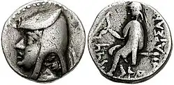 Tétradrachme montrant Mithridate Ier avec une barbe et un diadème royal et toujours l'inscription grecque en revers : ΒΑΣΙΛΕΩΣ ΜΕΓΑΛΟΥ (du grand roi).