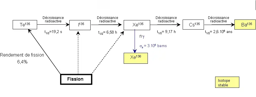 Par la suite, ces deux noyaux 136Xe et 135Cs sont pratiquement stables et de section efficace négligeable. Pour mémoire, le 135Cs est un produit de fission faiblement radioactif (d'une demi-vie de 2,6 millions d'années), ce qui pose d'autres problèmes pour le gérer en tant que déchet radioactif, mais il n'a pas d'incidence sur le fonctionnement d'un réacteur nucléaire.