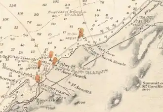 - ↑ Le mémorial est situé du côté sud de la vieille route longeant le fleuve à Pointe-au-Père.