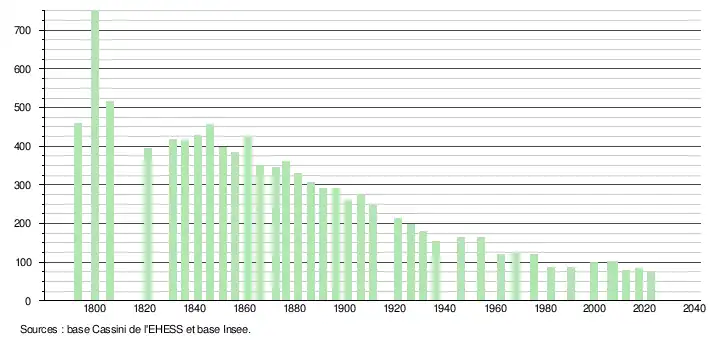 L'évolution du nombre d'habitants est connue à travers les recensements de la population effectués dans la commune depuis 1793. Pour les communes de moins de 10 000 habitants, une enquête de recensement portant sur toute la population est réalisée tous les cinq ans, les populations de référence des années intermédiaires étant quant à elles estimées par interpolation ou extrapolation[16]. Pour la commune, le premier recensement exhaustif entrant dans le cadre du nouveau dispositif a été réalisé en 2007[17].