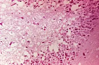 | Symptômes | Fièvre, céphalée, malaise (en), myalgie, nausée, vomissement, diarrhée, mal de gorge (en), examen des signes méningés (d), photophobie, diplopie, tremblement, spasme, parésie, réflexe cutané plantaire, encéphalomyélite (en) et coma |