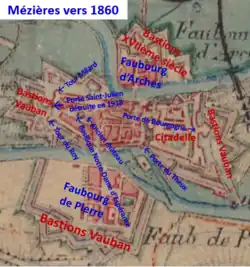 Le Maréchal de Saint-Paul, Chef ligueur décide de faire de Mézières un bastion catholique et de raser le tiers est de la ville pour construire une citadelle d’avril 1591 à octobre 1593. Cette fortification était destinée à protéger la ville d’une attaque d’Henri de la Tour Vicomte de Turenne prince de Sedan du parti huguenot. À l’est de la citadelle, la porte de Bourgogne dont l’entrée est défendue par un pont-levis remplace la porte de l’image du XIIIe siècle.