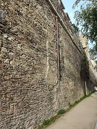 Les moellons sont de grès et de calcaire[B 5]. La construction utilise largement le réemploi de blocs issus de bâtiments antérieurs[C 7] : morceaux de colonnes, pilastres, chapiteaux[B 6]. La construction a pu utiliser des murs antérieurs utilisés comme parement intérieur[B 7]. Le mur a été constitué d'un coffrage en opus caementicium et de deux parements[C 7]. Le parement extérieur est constitué de trois rangs de moellons de roche et de deux rangées de briques[C 7].