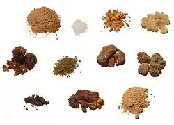 Les premières sont représentés par les résines brutes, éclat de bois odorant ou épices entières d'un côté et poudres de résine, de bois ou d'épices. Les éléments sont simplement réduis en une poudre plus ou moins fine, parfois additionnée d'huiles essentielles ou de parfum artificiel.
