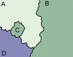 De même, une enclave dans un territoire externe ne partage normalement aucune frontière commune avec la frontière externe de ce territoire externe ; mais il arrive qu'il y ait un ou plusieurs points communs sur ces deux frontières quand il a été impossible de déterminer à quel territoire appartiennent ces points (et une petite zone tout autour de chaque point commun) où l'enclave touche la frontière externe du territoire externe.[pas clair]