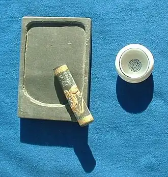 - ↑ Bergeon-Langle et Curie 2009, p. 878 « Encre de noix de galle », Petit, Roire et Vallot 2001.