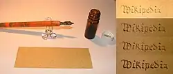 L’encre au gallo-tannate de fer est une encre noire à violette, fabriquée à partir de sels métalliques, surtout de sulfate ferreux mais parfois de sulfate de cuivre, et de divers tanins d’origine végétale. Encre noire emblématique du scriptorium monastique, elle est l’encre la plus utilisée en Europe entre les XIIe et XIXe siècles[1]. Cette encre tannique ou à base de tanins solubilisés est parfois dénommée encre ferrique, ferro-gallique ou métallo-gallique. Les dégradations irréversibles du papier dues à cette encre corrosive posent d'importants problèmes de conservation[2],[3].