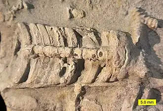 Endocaste de la coquille d'un Céphalopode de l'Ordovicien à carapace droite, montrant la structure interne de la coquille.