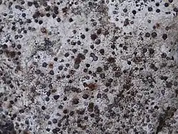 - ↑ L. Galsomiès, M. Robett & G. Orial, « Interaction lichens-roche sur monument historique en granite », Bull. Inf. As. Fr. Lichenol, no 3, , p. 35.