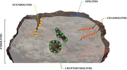 Des endolithes ont été découvertes en milieu terrestre et marin, des pôles aux montagnes en passant par les déserts, et jusqu'à 3 kilomètres de profondeur, et il pourrait en exister plus profondément[8],[9]. Là, la pression due à la profondeur et l'exposition à des métalloïdes et métaux lourds toxiques et à des conditions acides semble être une menace moins importante que l'augmentation de la température. Mais on connait des organismes hyperthermophiles encore capables de se reproduire à environ 120 °C (souche 121). Si c'est une limite absolue, il ne devrait plus y avoir de vie bactérienne à partir de 4-4,5 km sous la croûte continentale et à 7 ou 7,5 km sous le plancher océanique.