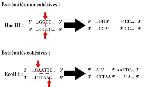 - extrémités cohésives, à bords collants, l'enzyme de restriction ne coupe pas au milieu de sa séquence de restriction, comme c'est le cas pour Eco RI qui reconnait la séquence G/AATTC.