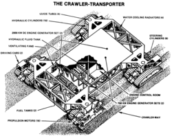Le Crawler-transporter est un engin pesant 2 721 tonnes, long de 40 mètres, pour une largeur de 35 mètres, avec une hauteur modifiable comprise entre 6 et 8 mètres. Il se déplace à une vitesse de 1,6 km/h à pleine charge et à 3,2 km/h à vide. Il comprend une plate-forme plate sur le dessus qui repose sur quatre trains comportant chacun deux chenilles. Chaque chenille est longue de 12,5 mètres et large de 2 mètres. Une chenille comprend 57 maillons et chaque maillon pèse environ une tonne. Les seize moteurs électriques chargés de mettre en mouvement les chenilles sont alimentés par quatre générateurs électriques de 1 000 kW qui tournent grâce à deux moteurs diesel de 2 750 ch. Deux autres diesel de 1 065 ch alimentent deux générateurs électriques de 750 kilowatts dont le rôle est de faire pivoter les chenilles et de maintenir la plate-forme à l'horizontale grâce à un système de vérins lorsque l'engin gravit la pente de 5 % qui mène au pas de tir. L'ensemble consomme 600 litres de gazole à l'heure. Le crawler met près de six heures pour déplacer le lanceur du bâtiment d'assemblage jusqu'au pas de tir[1].