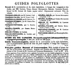 Publicité de 1864 pour les Guides polyglottes Garnier, où Carolino Duarte est présenté comme le co-auteur des versions English-Portuguese et Portugez-inglez, et page de titre de cette dernière (s.d.) qu'il signe seul. | ||
