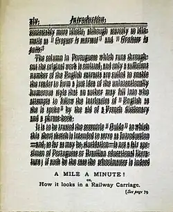 « A choice of familiar dialogues, clean of gallicisms, and despoiled phrases, it was missing yet to studious portuguese and brazilian Youth; and also to persons of others nations, that wish to know the portuguese language. We sought all we may do, to correct that want […] We did put, with a scrupulous exactness, a great variety own expressions to english and portuguese idioms; without to attach us selves (as make some others) almost at a literal translation […] The Works which we were confering for this labour, fond use us for nothing; but those what were publishing to Portugal, or out, they were almost all composed for some foreign, or for some national little acquainted in the spirit of both languages. It was resulting from that corelessness to rest these Works fill of imperfections, and anomalies of style; in spite of the infinite typographical faults which some times, invert the sense of the periods. It increase not to contain any of those Works the figured pronunciation of the english words, nor the prosodical accent in the portuguese; indispensable object whom wish to speak the english and portuguese languages correctly.