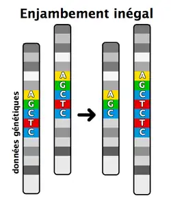 Avec la conversion génique, l'enjambement inégal représente un générateur principal de doublements génétiques et une source de mutation dans le génome.
