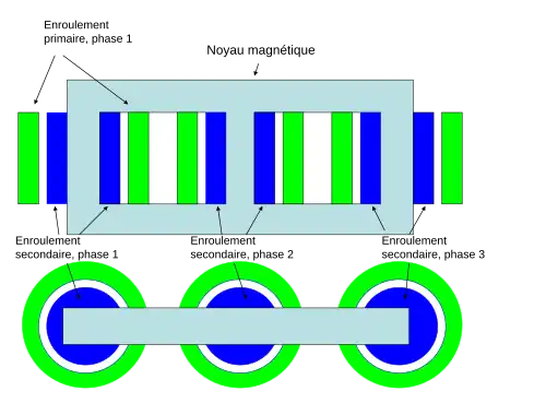 Les bobines (primaire, secondaire, tertiaire) sont enroulées de manière coaxiale autour des colonnes bobinées du noyau magnétique (voir illustration)[3].