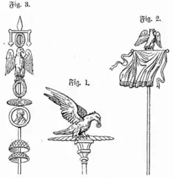 L’aquila (« aigle »), représente la légion depuis la réforme marianique en -104. Avant cette date, elle n’est que la première de cinq enseignes représentant la légion : l’aigle, le loup, le minotaure, le cheval et le sanglier. Il est porté par l’aquilifer et est rattaché à la première cohorte[17]. Symbole et protecteur de la légion, l’aigle reste la majeure partie du temps à l’abri dans l’autel du camp et n’accompagne les troupes que lorsque c’est l’ensemble de la légion qui se met en marche[18]. L’utilisation de l’aigle dure dans l’Empire d’Occident jusqu’à la disparition de celui-ci, puis persiste encore jusqu’au VIIe siècle dans l’Empire d’Orient[19].