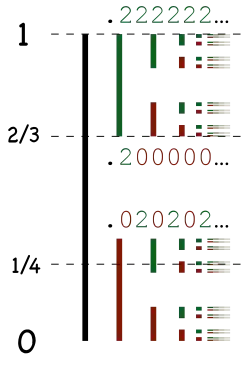 Par exemple le réel 1/3 est dans cet ensemble, puisqu'il admet les deux écritures 0,1000… et 0,02222… en base 3. Le réel 2/3 également (0,2000… ou 0,12222…). On peut remarquer que parmi les nombres admettant un développement propre et un développement impropre, il n'en existe aucun dont les deux écritures vérifient la propriété demandée.