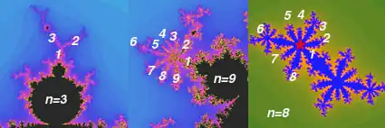 - Les autres bourgeons tangents à la cardioïde sont les points admettant d'autres périodicités. Pour tout nombre rationnel p/q, avec p et q premiers entre eux, il existe un bourgeon presque circulaire tangent à la cardioïde au point . Chacun de ces bourgeons est appelé « bourgeon p/q ». Il s'agit de l'ensemble des points paramètres convergeant vers un cycle de période q.