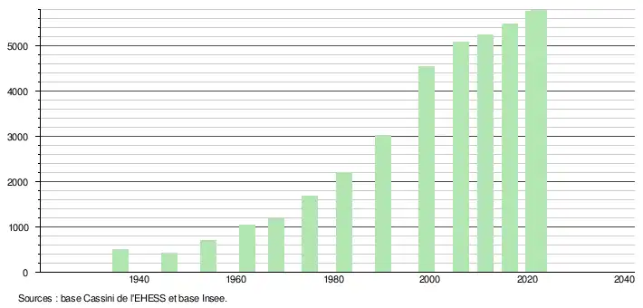 L'évolution du nombre d'habitants est connue à travers les recensements de la population effectués dans la commune depuis 1936. Pour les communes de moins de 10 000 habitants, une enquête de recensement portant sur toute la population est réalisée tous les cinq ans, les populations de référence des années intermédiaires étant quant à elles estimées par interpolation ou extrapolation[29]. Pour la commune, le premier recensement exhaustif entrant dans le cadre du nouveau dispositif a été réalisé en 2006[30].