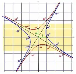 - ↑ Aux interversions près des puissances négatives impaires de ω avec leurs opposés.