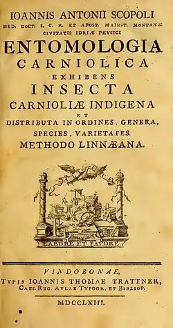 Carl von Linné avait utilisé la structure des ailes comme base de sa classification. Johan Christian Fabricius s'était servi de la structure des pièces buccales des insectes. Scopoli crée une taxonomie considérant l'insecte dans son entier[2] ; il définit ainsi un système plus proche de la classification phylogénétique actuelle.