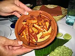 Dans les restaurants huppés, les larves de fourmis sont mélangées à de l'huile et de l'ail, puis servies avec des tortillas en guise d'entrée raffinée (et très chère). Ce plat, appelé escamoles, est souvent surnommé « caviar mexicain ». Les sauterelles au chocolat, servies dans le sud du Mexique et au Guatemala, sont des friandises très appréciées par les enfants et un exemple notable de plat à base d'insectes. Le goût de Lethocerus indicus et de Corisella mercenaria est réputé très fort[60]. Les chapulines sont des criquets consommés frits avec des piments, de l'ail ou du jus de citron.