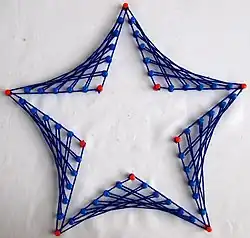 Un calcul d'enveloppe facile à réaliser matériellement consiste à relier par des ficelles des pointes formant une figure simple. Ainsi, on peut construire deux rangées de pointes formant des intervalles réguliers, et relier successivement les pointes de l'une et l'autre rangée. L'enveloppe est la courbe « dessinée » par l'entrelacs de ficelles.