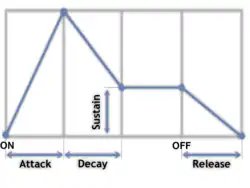 L'enveloppe Attack Decay Sustain Release (Attaque Chute Entretien Extinction en français[4], parfois également traduit en transitoire d'attaque, déclin, maintien et chute[5]) est l'enveloppe la plus courante dans les synthétiseurs. Synchronisée avec le clavier, elle permet de moduler le son de chaque note à l'aide de quatre paramètres qui sont :