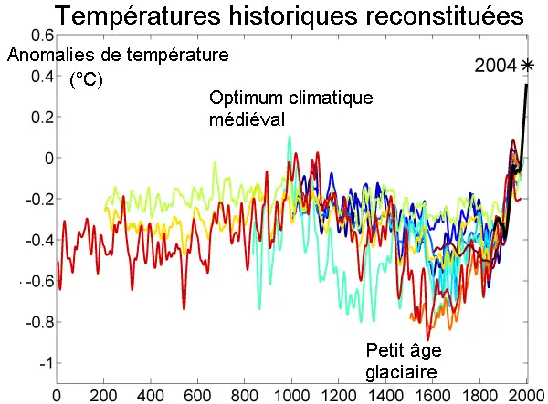 - le réchauffement climatique, défini par le secrétaire général des Nations unies comme un enjeu majeur de notre temps[72], est très probablement dû à un rejet massif de gaz à effet de serre d'origine humaine[73]. Mettant en jeu des processus très longs, ce réchauffement pourrait avoir des conséquences négatives importantes sur la biodiversité[74], le niveau des océans, et les courants marins au niveau mondial, et pourrait entraîner ou favoriser des destructions d'écosystèmes, des désertifications ou des bouleversements climatiques graves à une échelle locale (sécheresses, inondations, intensité des cyclones…)[73]. Les conséquences affecteraient une majeure partie de la population mondiale et seraient multiples et globalement négatives[73].