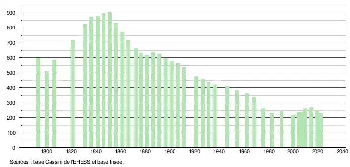 L'évolution du nombre d'habitants est connue à travers les recensements de la population effectués dans la commune depuis 1793. Pour les communes de moins de 10 000 habitants, une enquête de recensement portant sur toute la population est réalisée tous les cinq ans, les populations de référence des années intermédiaires étant quant à elles estimées par interpolation ou extrapolation[43]. Pour la commune, le premier recensement exhaustif entrant dans le cadre du nouveau dispositif a été réalisé en 2004[44].