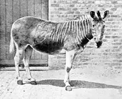 Le Quagga ou couagga (selon les classifications : Equus quagga quagga ou Equus burchellii quagga ou parfois encore Equus quagga) était une sous-espèce de zèbre d'Afrique du Sud, beige, rayé seulement sur l'encolure et l'avant du corps. Mis en concurrence avec le bétail domestique des paysans, il fut exterminé au XIXe siècle par les Boers, colons d'origine néerlandaise implantés en Afrique du Sud. La viande des quaggas était largement consommée et leur peau tannée pour la confection de sacs. Les dernières photos d'un quagga vivant sont celles d'une femelle photographiée en 1870 au zoo de Londres[1]. Le dernier quagga sauvage fut abattu en 1878 et la sous-espèce s'éteignit définitivement le , au zoo d'Amsterdam[2]. Il n'en reste aujourd'hui que quelques peaux, des crânes, 23 spécimens empaillés et de rares photographies conservées dans des collections. Un spécimen naturalisé, conservé au Museum d'Histoire Naturelle de Paris, fut offert en 1784 à Louis XVI. Il vécut en captivité jusqu'en 1798, la Convention ayant transféré la ménagerie royale au Jardin des plantes[3].