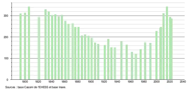 L'évolution du nombre d'habitants est connue à travers les recensements de la population effectués dans la commune depuis 1793. Pour les communes de moins de 10 000 habitants, une enquête de recensement portant sur toute la population est réalisée tous les cinq ans, les populations de référence des années intermédiaires étant quant à elles estimées par interpolation ou extrapolation[24]. Pour la commune, le premier recensement exhaustif entrant dans le cadre du nouveau dispositif a été réalisé en 2005[25].