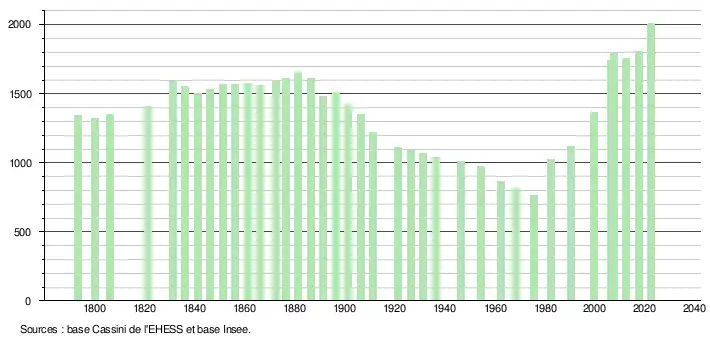 L'évolution du nombre d'habitants est connue à travers les recensements de la population effectués dans la commune depuis 1793. Pour les communes de moins de 10 000 habitants, une enquête de recensement portant sur toute la population est réalisée tous les cinq ans, les populations de référence des années intermédiaires étant quant à elles estimées par interpolation ou extrapolation[29]. Pour la commune, le premier recensement exhaustif entrant dans le cadre du nouveau dispositif a été réalisé en 2007[30].