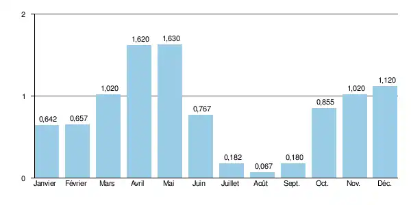 D'autre part, les crues observés sont telles la QIX 10 est à 31 m3/s pour un QJX 10 de 12 m3/s[2] et les maximums connus et enregistrés sont de 63 m3/s en débit instantané maximal le , et le la crue eut une hauteur maximale instantanée de 321 cm et un débit journalier maximal de 28,5 m3/s[2].