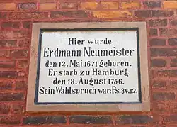 Erdmann Neumeister est un poète et théologien allemand de la période baroque né le à Uichteritz et mort le à Hambourg