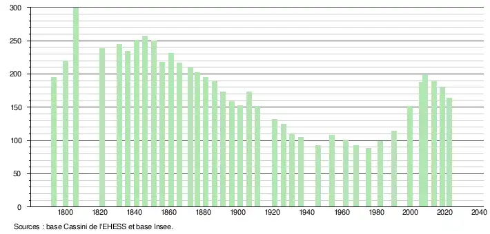 L'évolution du nombre d'habitants est connue à travers les recensements de la population effectués dans la commune depuis 1793. Pour les communes de moins de 10 000 habitants, une enquête de recensement portant sur toute la population est réalisée tous les cinq ans, les populations de référence des années intermédiaires étant quant à elles estimées par interpolation ou extrapolation[26]. Pour la commune, le premier recensement exhaustif entrant dans le cadre du nouveau dispositif a été réalisé en 2008[27].